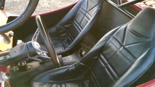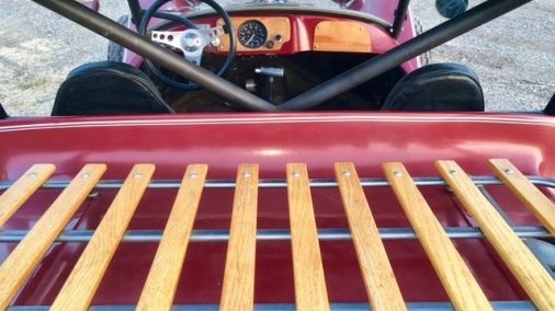 1961 VW, pan shortened and narrowed with a 1969 Berry Mini-T fiberglass body with original factory gel coat intact. Has a 1500 VW motor and 4 speed bus transmission.